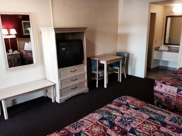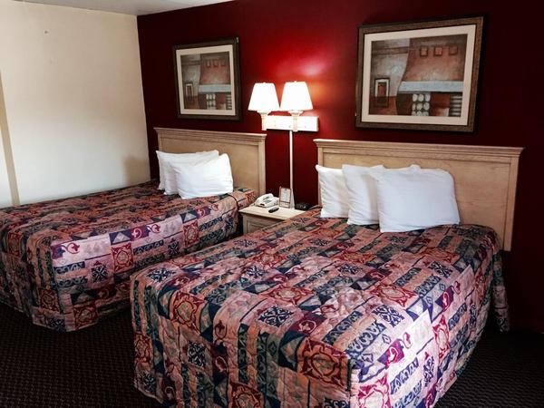 Room with two queen beds that includes cable TV, free wifi, free toiletries, AC/Heat, a microwave and small refrigerator, sitting area and wake up service.
